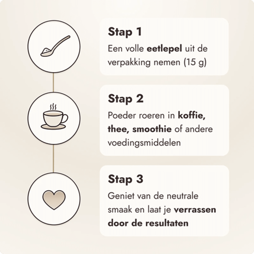 Het poeder lost moeiteloos op in koffie, thee, smoothies of andere drankjes. Dankzij de neutrale smaak past het perfect in je dagelijkse routine.